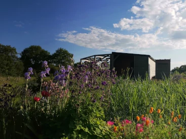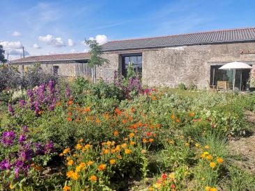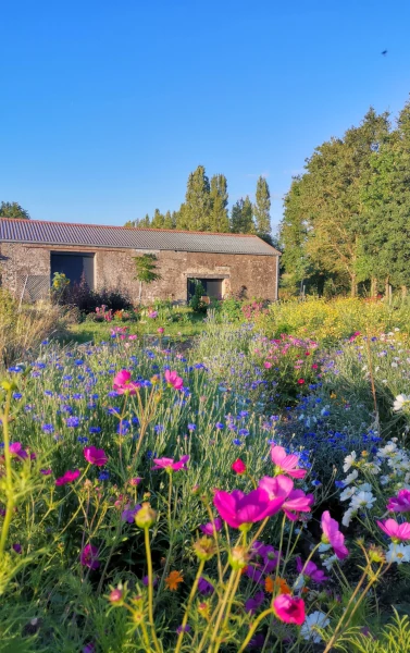 Un chêne vénérable, un vieux puits enchâssé dans une butte ombragée, un bosquet, un pré bien vert... c'est dans cet écrin que j'ai installé mes fleurs et aromatiques.